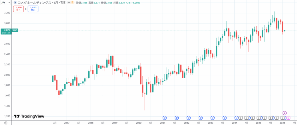 コメダホールディングスの月足チャート(2015~) 引用元:Trading view