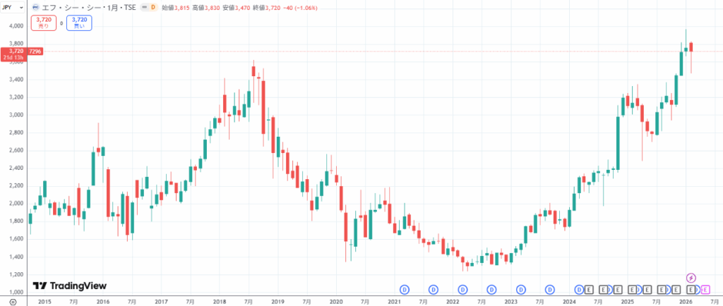 エフ・シー・シーの月足チャート(2015~) 引用元:Trading view