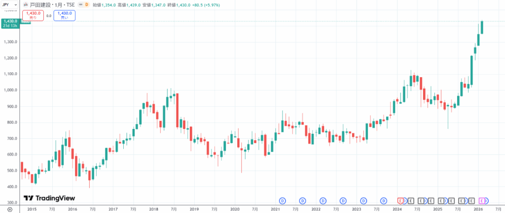 戸田建設の月足チャート(2015~) 引用元:Trading view
