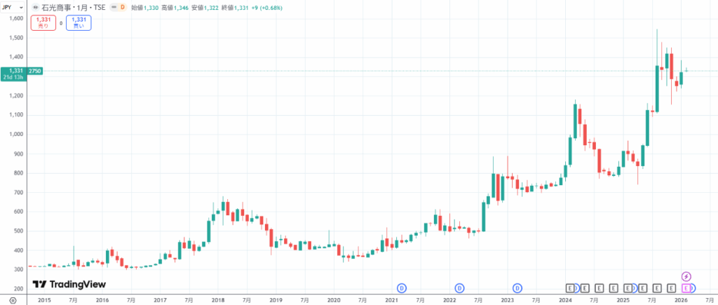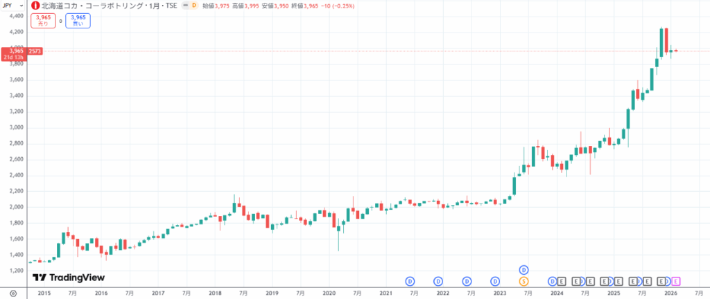 北海道コカ・コーラボトリングの月足チャート(2015~) 引用元:Trading view