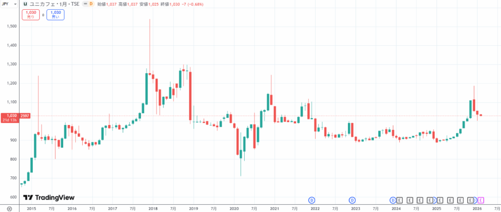 キーコーヒーの月足チャート(2015~) 引用元:Trading view