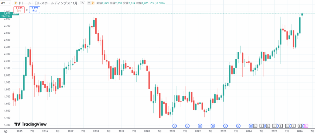 ダイドーグループホールディングスの月足チャート(2015~) 引用元:Trading view