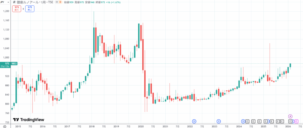 銀座ルノアールの月足チャート(2015~) 引用元:Trading view