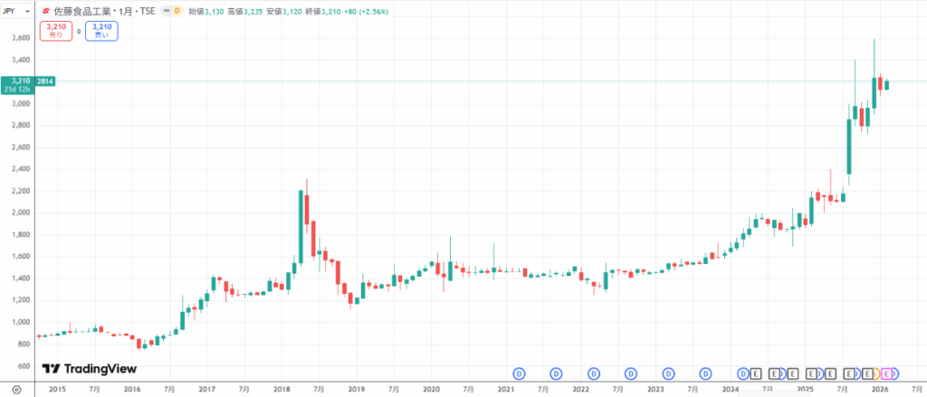 佐藤食品工業の月足チャート(2015~) 引用元:Trading view